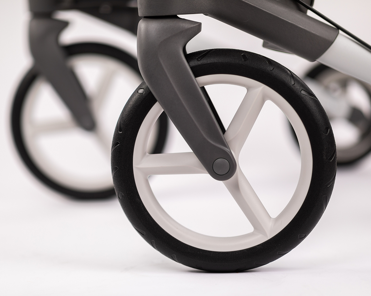 De store forhjul og stødabsorberende dæk sikrer stabil og jævn manøvredygtighed på uensartet underlag som på stier, brosten, sand eller grus.